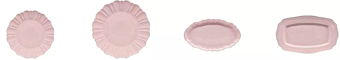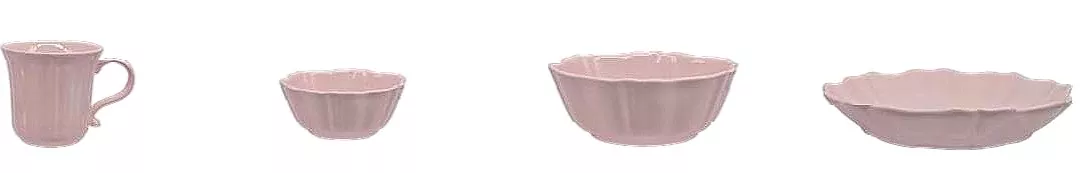 Цей макарон рожевого керамічного миски включає дев'ять штук (миска, тарілка, глибока тарілка, чашка та чайник). Цей універсальний продукт можна налаштувати індивідуально або як повний набір усіх дев'яти. Доступний у розмірах, щоб відповідати кожному обідньому випадку, від сніданку з крупними мисками до тарілкових тарілок до післяобідніх чайних чашок, набір обслуговує широкий спектр потреб.
